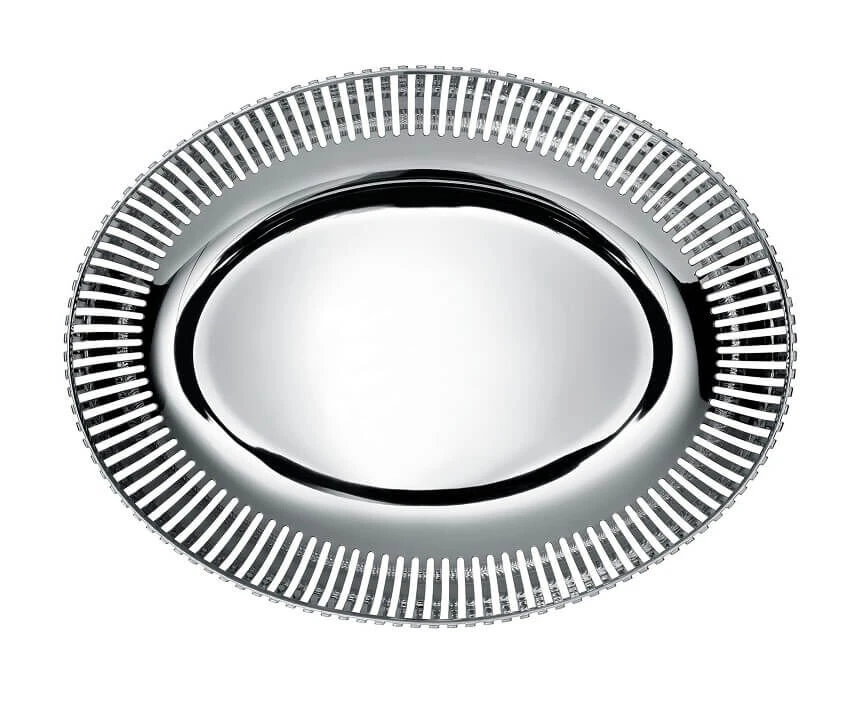 De fruitschaal van Alessi is ontworpen door Pierre Charpin. Het ontwerp is gebaseerd op de klassieke 18e en 19e eeuwse zilveren dienbladen. Presenteer bijvoorbeeld fruit en brood in de schaal.