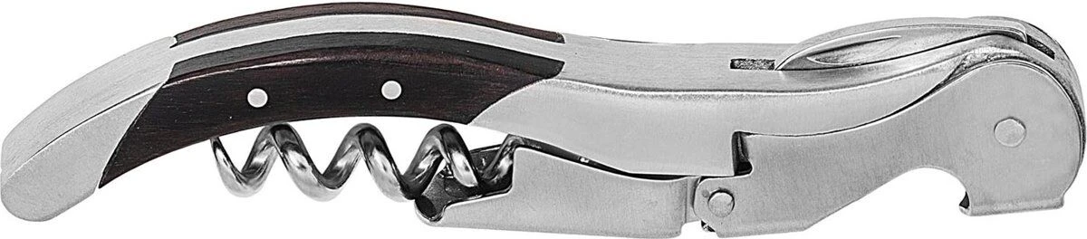 De Cookai kurkentrekker is volledig gemaakt van roestvrij staal met een houten handgreep. De opener is voorzien van een kurkentrekkerspiraal, een twee-staps hefboom, een capsulesnijder en een flesopener.
