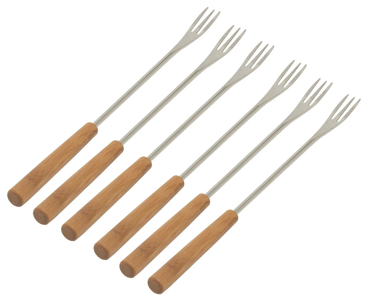 De Kuhn Rikon fonduevorken worden geleverd in een set van 6 stuks. De fonduevorken zijn van roestvrij staal en bamboe en hebben een lengte van 27 cm. Gebruik de vorken bij uw kaas-, chocolade- of Chinese fondue.