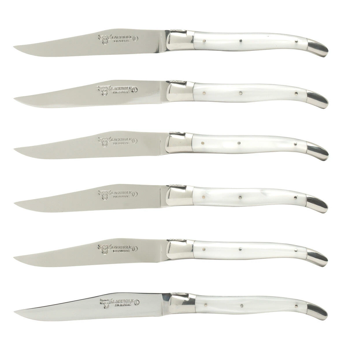 De Laguiole en Aubrac steakmessenset bestaat uit 6 messen met een messenstalen lemmet van 11,5 cm. Het totale mes heeft een lengte van 23 cm. Het heft van het mes is van wit acryl. U gebruikt het steakmes met de gladde snede voor het snijden van bereid vlees aan tafel.