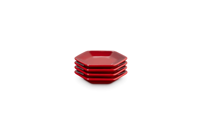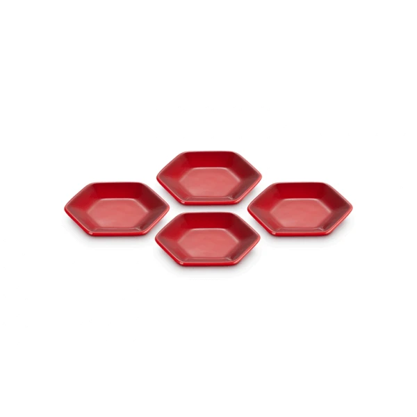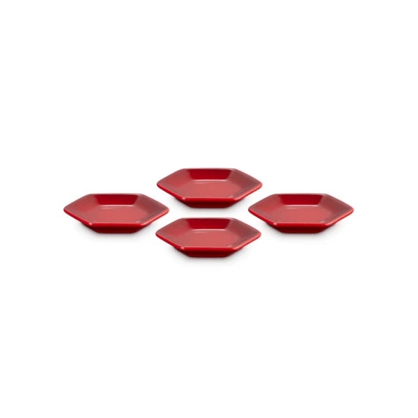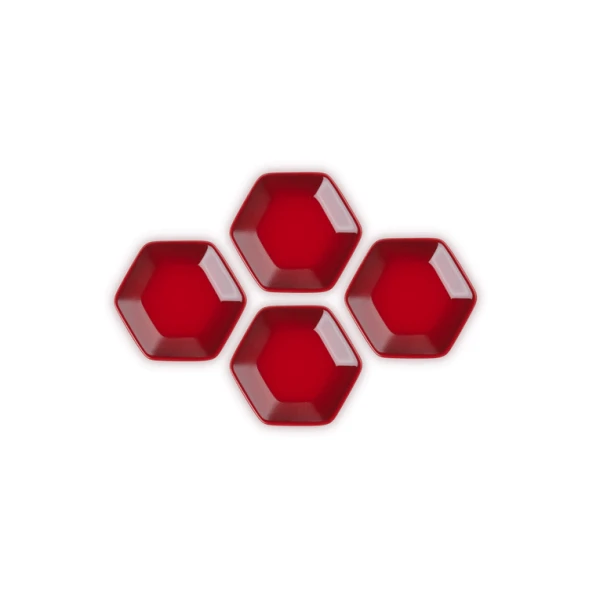 De vier Le Creuset serveerschaaltjes zijn gemaakt van geglazuurd aardewerk, uitgevoerd in kersrood. De schaaltjes zijn 8,5 cm breed, 9,5 cm lang en 1,5 cm hoog. Gebruik om (dip)sauzen te serveren.
