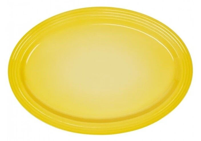 De ovale schaal van Le Creuset is gemaakt van kersrood Soleil, geel, geglazuurd aardewerk. De lengte van de schaal is 46 cm, de breedte 31,5 cm en heeft een hoogte van 3,2 cm. Gebruik de schaal om bijvoorbeeld een salades te serveren.