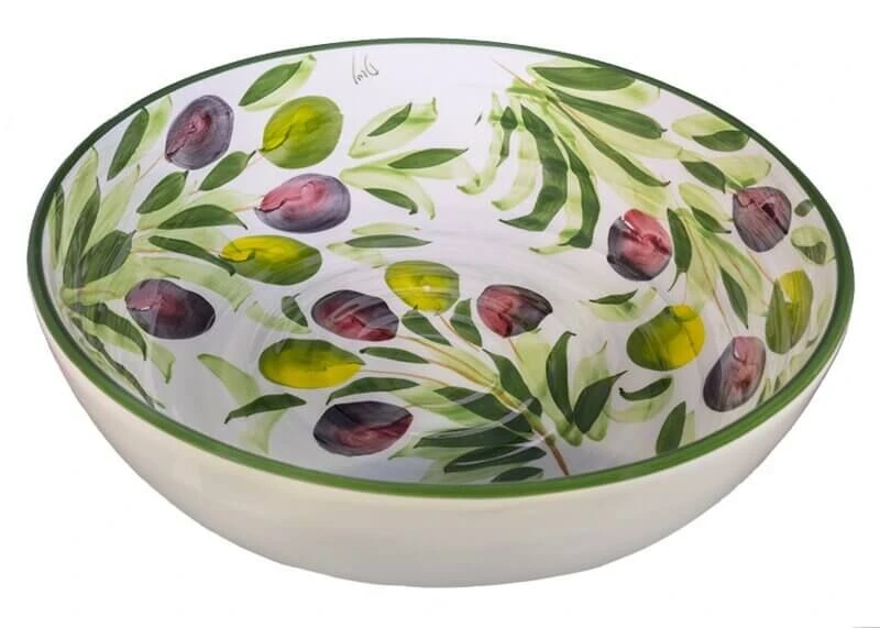 De Oldenhof-schaal heeft een olijfmotief en een diameter van 28 cm. De schaal is gemaakt van keramiek en te gebruiken voor het presenteren van fruit, (stok)brood of pasta.