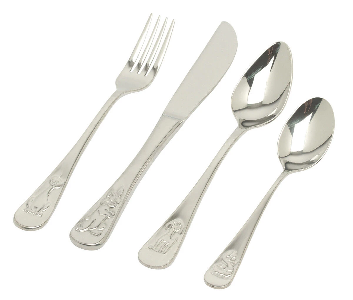 Het Van Kempen & Begeer Junior kinderbestek is voorzien van afbeeldingen van verschillende vrolijke dierenvriendjes. Op het mes staat een konijn, op de vork een kat, een hond siert de eetlepel en op dessertlepel is een eendje te vinden. Het mes is 19 cm lang, de vork en lepel elk 16 cm en de dessertlepel meet 13 cm in lengte.