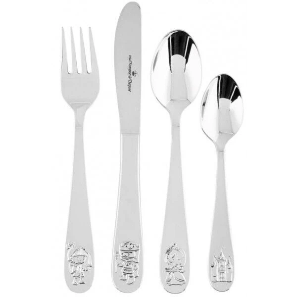 Met het Van Kempen & Begeer Junior kinderbestek eten ook de jongste eters met plezier mee. De bestekdelen zijn voorzien van vrolijke afbeeldingen. Het bestek is vervaardigd uit hoogwaardig roestvrij staal dat goed bestand is tegen voedselzuren. Het formaat van onderdelen van het bestek zijn goed afgestemd op de kinderhand en -mond. Het mes heeft een afgeronde bovenzijde waarmee niet ‘gestoken’ kan worden. Tevens is het mes botter waardoor het veiliger is in gebruik door kinderen.